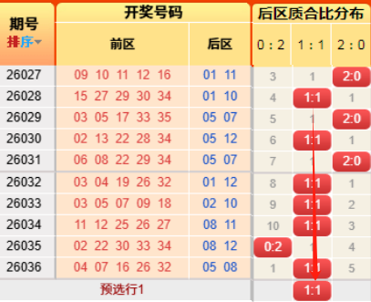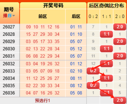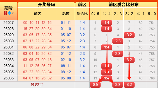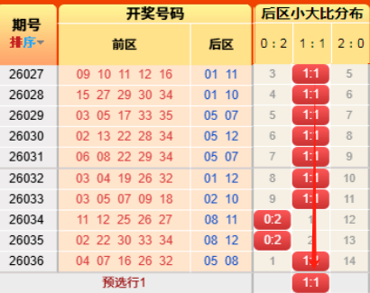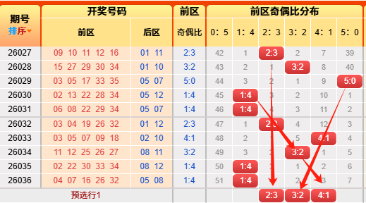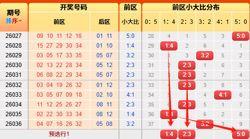 上期前区小大比3:2。言归正传我们继续用历史数据说话,前区小大比分成6种0:5、1:4、2:3、3:2、4:1、5:0(如图),我统计了一下历史出现次数,0:5出现107次、1:4出现520次、2:3出现987次、3:2出现824次、4:1出现359次,5:0出现57次,再看近10期小大比出现次数比为0:2:4:2:1:1,通过历史数据对比观察以及根据遗漏对称理论原则,故本期我们选择1:4、2:3、5:0;(具体精准方向请查看小车小大比精选)