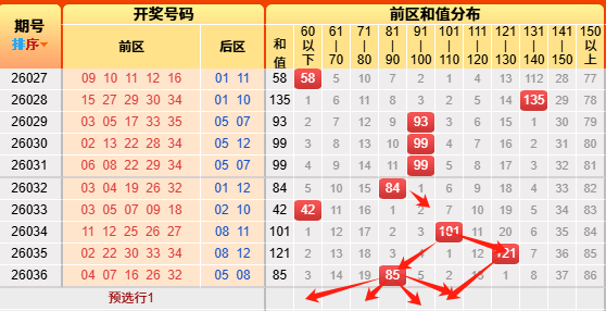 上期开出和值85,命中区间。本次我们先根据历史次数统计,和值60以下开出256次、61-70开出241次、71-80开出377次,81-90开出491次、91-100开出503次,101-110开出386次、111-120开出315次、121-130开出157次、131-140开出91次、141-150开出27次、150以上开出9次,再来看近十次以上和值分别开出了2次、0次、0次、2次、3次、1次、0次、1次、1次、0次、0次 ,低于阈值的有60区间以下、61-70区间、81-90区间、91-100区间、101-110区间、121-130区间,再根据遗漏斜率对称理论,本期注意71-80区间、60以下区间、91-100区间、101-110区间。
