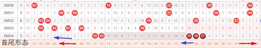 如图所示:首尾制约平衡组范围依次为:推缩推,缩推? 本期形态范围优先选择红色拉伸首尾。由于上期号码处在首尾换4连后分割4连形成间隔1两组走势继续分割,本期宜采取继续左推走势形成形态,或体现0连号防连号组走势。