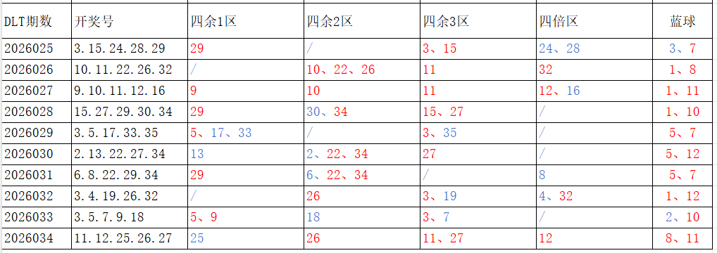 分享第一个数据分析:四分区统计数据。相对于传统的三分区,个人习惯使用四分区,就是把35个红球号码除以4,所得的余数分区如下: