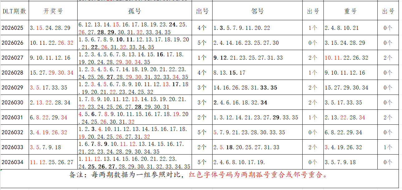 如图,以近两期数据为一组,进行对比分析,相同的孤号、邻号可能在下期开出。本期参考孤号:1.2.3.4.5.6.7.8.9.14.15.16.17.18.19.20.21.22.23.29.30.31.32.33.34.35;邻号:10.13.24.28。重点关注:孤邻号重合号码:***(会员专区可见)。个人分析,仅供参考。