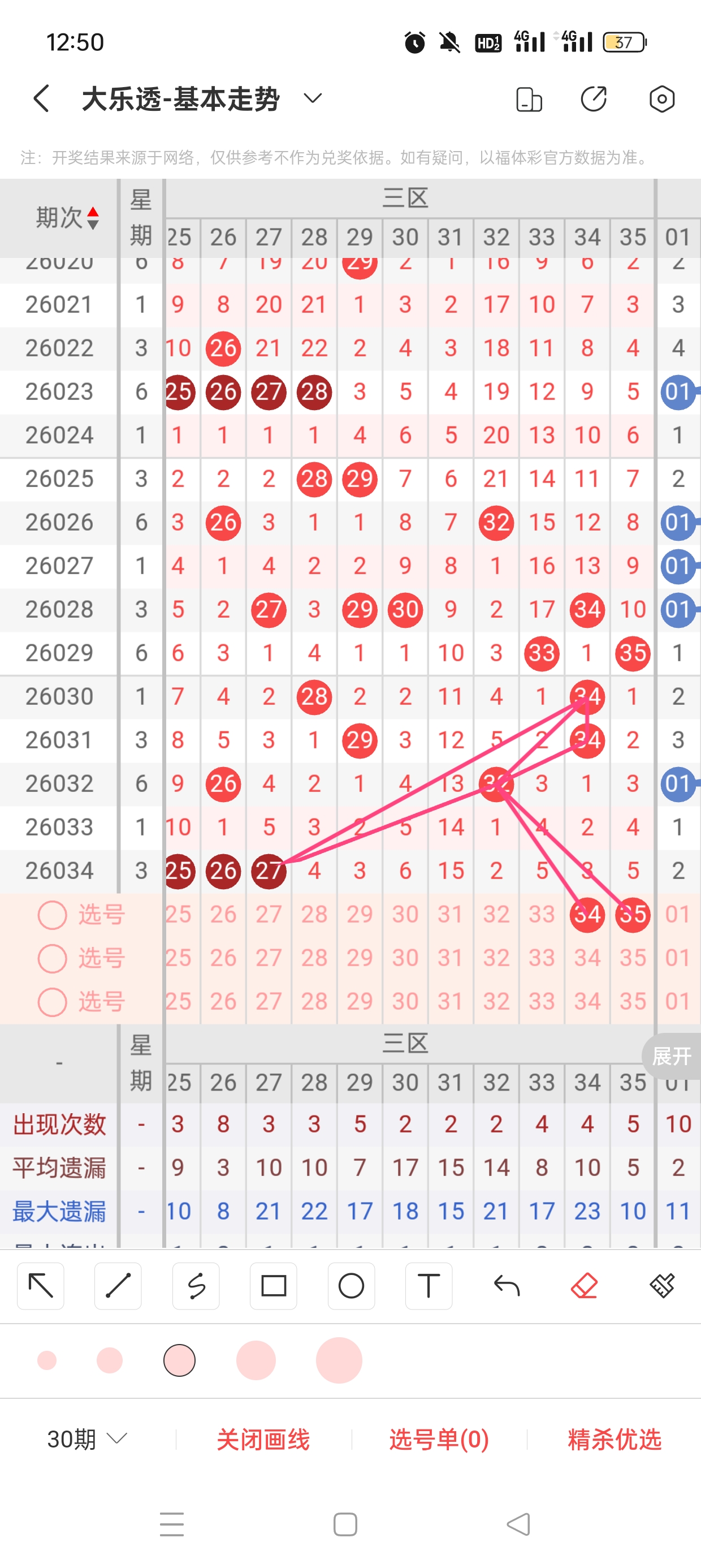 三区(25-35)近38期本区邻孤传13邻26孤1传,孤号热度高,本期着重邻传。近38期本区012路10:10:20,2路热度高,本期着重0/1路。34、35分别遗漏3期、5期,两者与32之间呈现向右遗漏递减态势,需防。