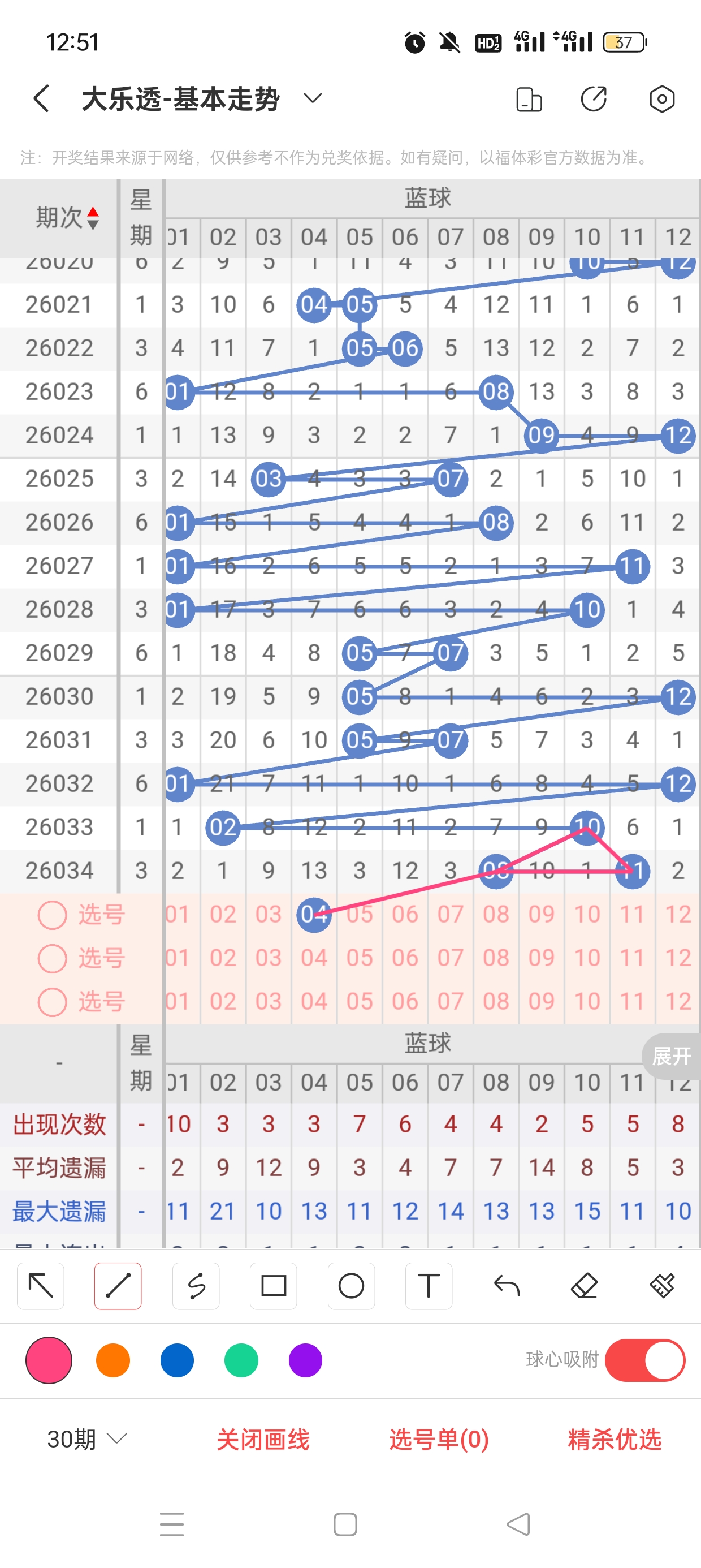 后区(1-12)近38期本区012路6:25:11,1路热度高,本期着重0/2路。4已遗漏13期,与8之间呈现向左遗漏递减态势,需防。