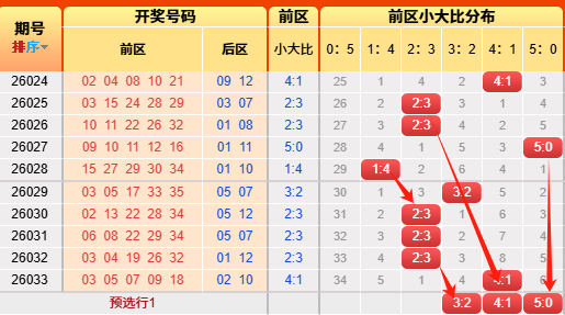 上期前区小大比4:1,推测正确。言归正传我们继续用历史数据说话,前区小大比分成6种0:5、1:4、2:3、3:2、4:1、5:0(如图),我统计了一下历史出现次数,0:5出现107次、1:4出现519次、2:3出现986次、3:2出现823次、4:1出现359次,5:0出现57次,再看近10期小大比出现次数比为0:2:5:1:1:1,通过历史数据对比观察以及根据遗漏对称理论原则,故本期我们选择5:0、3:2、4:1;(具体精准方向请查看小车小大比精选)