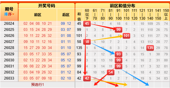 上期开出和值42,围住区间,也想到了会小号居多,只是没想到这么小的数值,所以只能中个3+2。本次我们先根据历史次数统计,和值60以下开出256次、61-70开出241次、71-80开出376次,81-90开出491次、91-100开出503次,101-110开出385次、111-120开出315次、121-130开出156次、131-140开出91次、141-150开出27次、150以上开出9次,再来看近十次以上和值分别开出了3次、0次、0次、1次、4次、1次、0次、0次、1次、0次、0次 ,低于阈值的有60区间以下、61-70区间、81-90区间、91-100区间、101-110区间、121-130区间,再根据遗漏斜率对称理论,本期注意61-70区间、90-100区间、101-110区间、131-140区间。