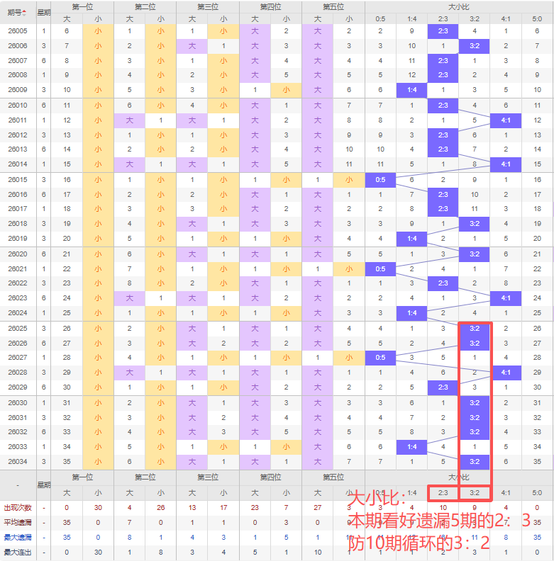 上期大小比:3:2,近10期大小比出现情况:3:2、3:2、0:5、4:1、2:3、3:2、3:2、3:2、1:4、3:2,最近10期出现6期3:2,出现1期2:3,出现2期4:1,出现0期1:4,出现0期5:0,出现1期0:5,根据近10期规律本期看好遗漏5期出2:3,防10期循环出3:2,综上所述推荐大小比推荐:3:2,重点关注:2:3。
