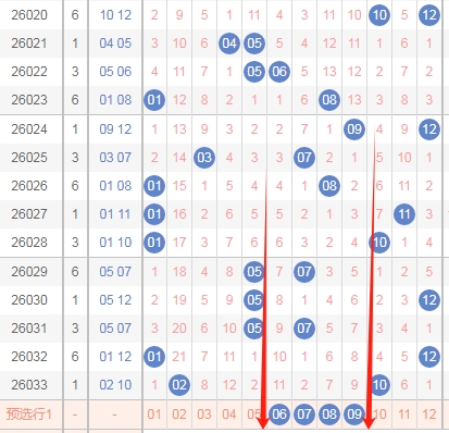 上图是体彩大乐透后区开奖号码走势分布图,我标注出来的红色箭头表示左边这个数字最近开出的奇数多,那么本期我觉得继续关注出偶数数字,那么本期左边这个数字的范围就是02 04 06 08 10。