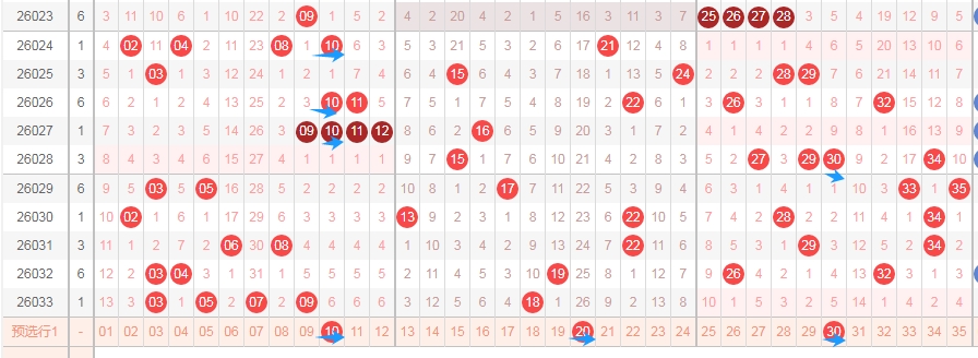 上图是体彩大乐透前区开奖号码走势分布图,我标注出来的数字都是0尾数的数字10 20 30,标注出来的蓝色小箭头就知道,最近0尾数数字连续遗漏了5期,那么本期1尾数的数字10 20 30可以关注出1个。
