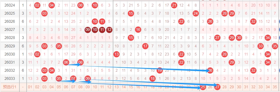 上图是体彩大乐透前区开奖号码走势分布图,我标注出来的蓝色箭头,你们看看上面出现了06 08后一期就出现了数字26也就是可以看06变成了同尾数26,那么上期开出数字05 07本期是不是可以看5尾数的同尾数25,或者上期开出数字了07 09本期是不是可以看7尾数的同尾数27。那么根据这个特点,本期可以看数字25 27?