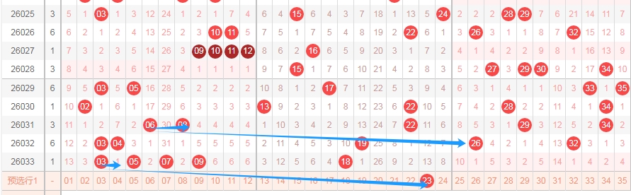 上图是体彩大乐透前区开奖号码走势分布图,我标注出来的蓝色箭头,你们看看上面出现了06 08后一期就出现了数字26也就是可以看06变成了同尾数26,那么上期开出数字03 05本期是不是可以看3尾数的同尾数23?