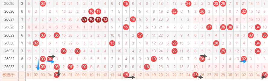 上图是体彩大乐透前区开奖号码走势分布图,我标注出来的蓝色箭头,第032期号码可以看成04 32看成2尾数4尾数,后一期就出现了2尾数4尾数中间的尾数3尾数,其中3尾数出现了两次03和03,那么第032期还出现了04 26可以看成4尾数和6尾数后一期出现了5尾数05,那么本期可以看5尾数继续出现,这样就可以和两个3尾数相似,那么这里就得到一个结论5尾数数字05 15 25 35应该至少出一个。