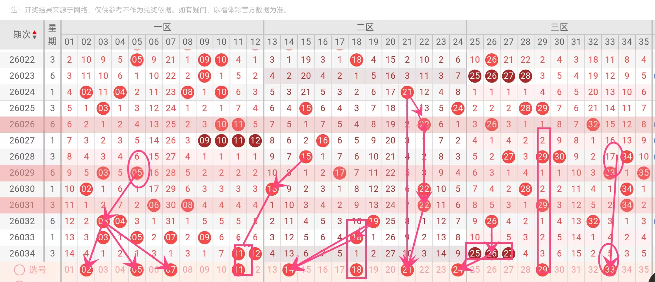 区间均衡:前区1-12(一区)选02、05、07、11,共4码;13-24(二区)选14、18、21,共3码;25-35(三区)选24、29、33,共3码。三区分布均衡,避免过度集中。24虽近10期出现2次,但属于二区向三区过渡的桥梁号,且同尾4近期活跃(04、14、24),看好延续;29近30期出现3次,但最近一次为2026025,遗漏10期,达到其历史最大遗漏边缘;33出现4次,但近8期无现,且与35形成大号呼应,35已被杀,33成为大号首选。