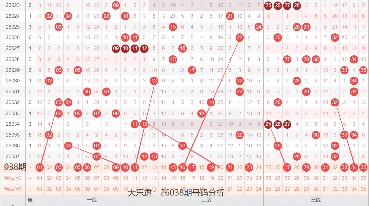 通过上期号码的简单分析,我们看下26038期红色号码球的总体走势,如下图: