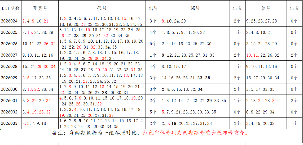 如图,以近两期数据为一组,进行对比分析,相同的孤号、邻号可能在下期开出。本期参考孤号:1.11.12.13.14.15.16.20.21.22.23.24.25.26.27.28.29.30.31.32.33.34.35;邻号:2.4.6.8.10.17.19。重点关注:孤邻号重合号码:***(会员专区可见)。个人分析,仅供参考。