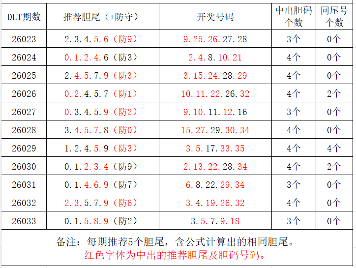 如图,每期推荐胆尾中出1-4个。上期推荐胆尾中出3尾3码!推荐胆尾是按照公式计算的顺序,不定位红球号码的顺序。本期推荐胆尾:7尾/8尾/2尾/9尾/0尾,加推防守胆尾+胆码号码:***(会员专区可见)。个人分析,仅供参考。