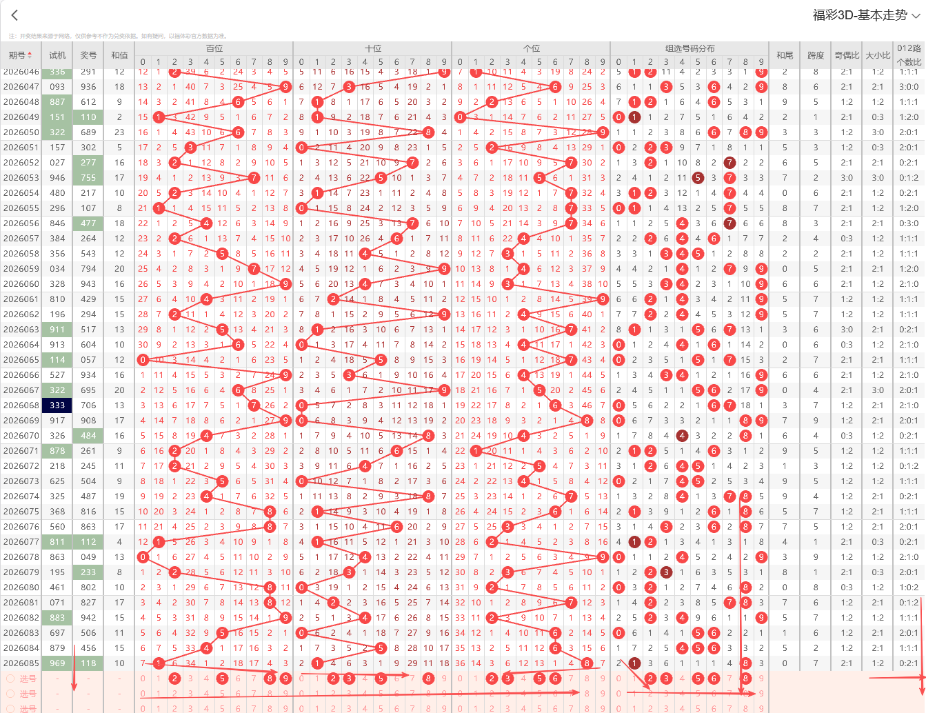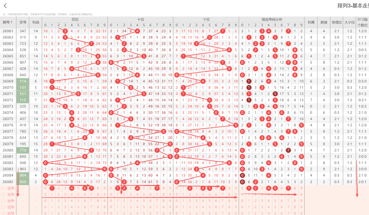 ①百位:上期开出大号偶数0号,在历史开奖记录中显示一般正常的奇偶周期平均在1~3期为普遍现象,偶数连续开出2期上期为0路号码,依据奇偶以及012路周期性规律的转变特征点即本期1路号码有开出的趋势0路号码注意预防。