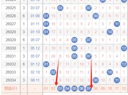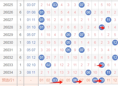 上图是体彩大乐透后区开奖号码分布图,我标注出来的红色箭头中间这个区域的数字03 04 05 06 07已经连续遗漏了3期,那么本期这个区域的数字开出的机会是有的,关注这个区域的数字03 04 05 06 07出一个或者两个。