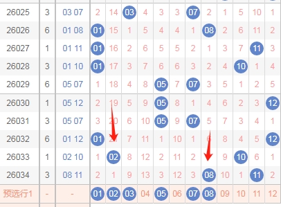 上图是体彩大乐透后区开奖号码分布图,我标注出来的红色箭头表示后区左边这个数字的遗漏周期,上期开出数字08遗漏周期是7期,上上期开出数字02遗漏周期是21期,那么本期可以关注遗漏周期小的数字01 02 03 05 07 08。