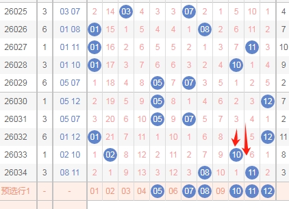 上图是体彩大乐透后区开奖号码分布图,我标注出来的红色箭头表示后区右边这个数字的遗漏周期,上期开出数字11遗漏周期是6期,上上期开出数字10遗漏周期是4期,那么本期可以关注遗漏周期小的数字05 07 08 10 11 12。