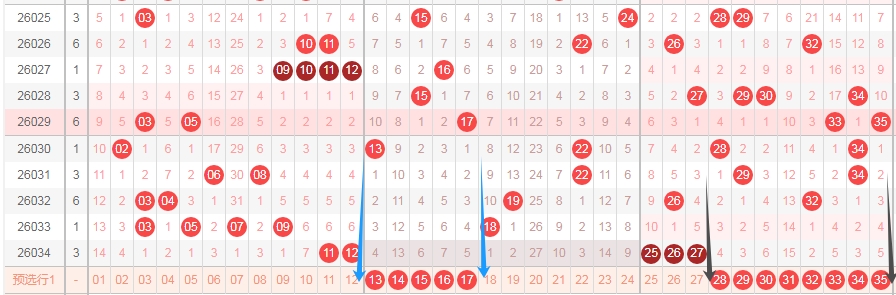 上图是体彩大乐透前区开奖号码走势分布图,我标注出来的蓝色箭头中间这些数字13 14 15 16 17已经连续4期没出现号码,最近十几期这个区域出号码不多,那么本期关注这个区域的数字出1个或2个,同理,黑色箭头标注出来的数字28 29 30 31 32 33 34 35连续两期没出现号码,本期这个区域出号码的机会是有的,关注这个区域的数字出2个或者3个吧。