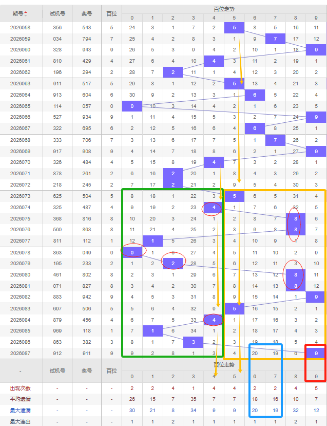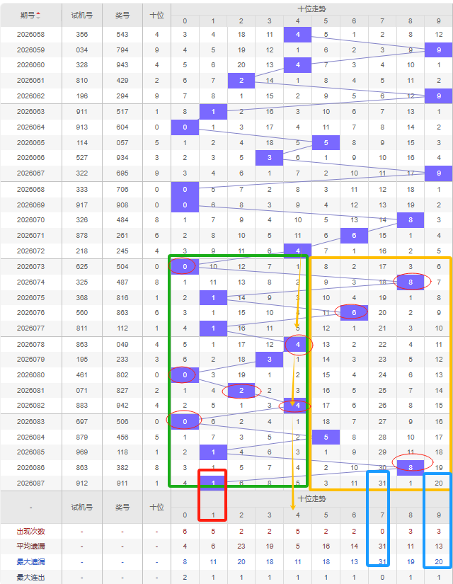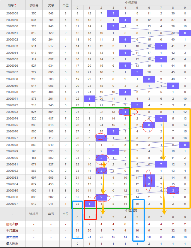 福彩3D第2026088期个位先分析奇数偶数,近十五期开出奇数号6期,开出偶数号9期,开出偶数号的概率比开出奇数号的概率大。近十余期都是奇数偶数间隔开出的,上一期又开出了奇数1号,本期还是看好增加奇数,建议考虑遗漏期数较大的奇数号,比如5号遗漏十期以上且达到平均遗漏期数和最大遗漏期数,都可以防冷号开出。7号本期若开出则形成6-6的形态。