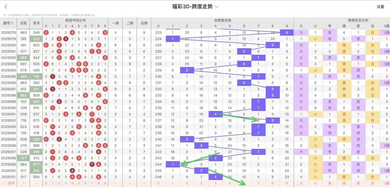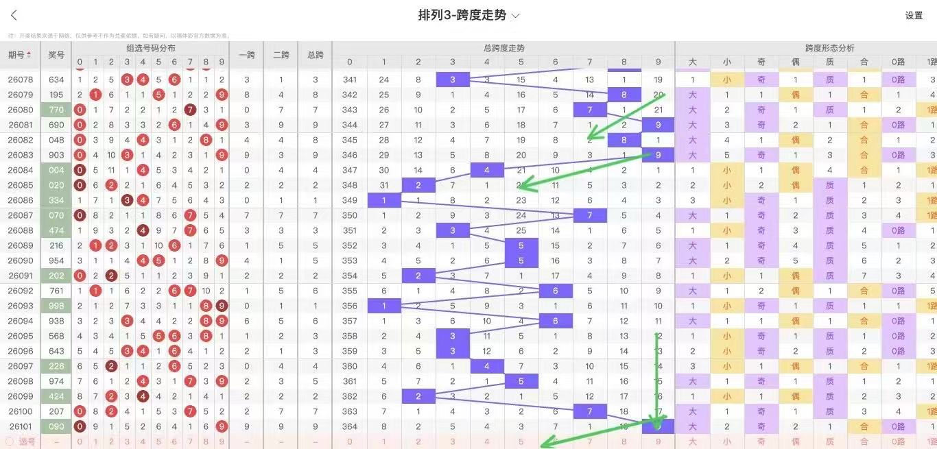10期内跨度走势为:6-1-6-3-3-4-2-7-2-9,10期内大小跨比为4:6,奇偶跨比5:5,百期内跨度9共开出10次,下期数据:6 3 4 6 7 9 7 8 4 近期较热,考虑跨度9开出后容易出大跨度,近期大小规律小:奇:质,所以接下来继续小跨,奇跨度表现!