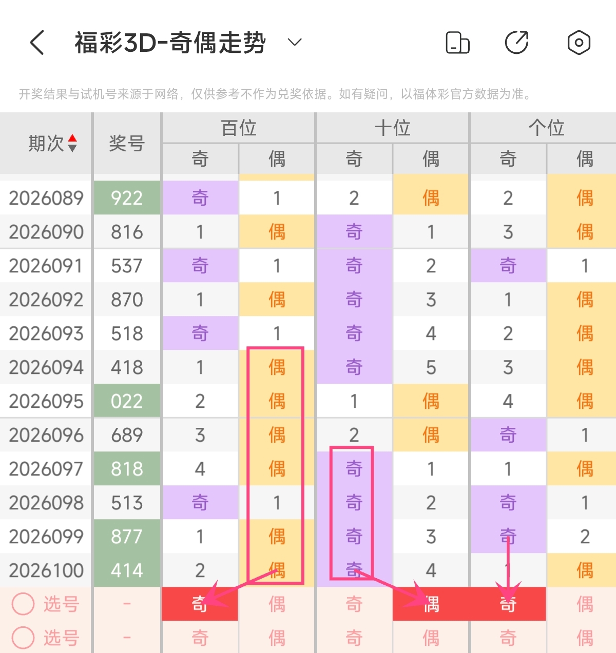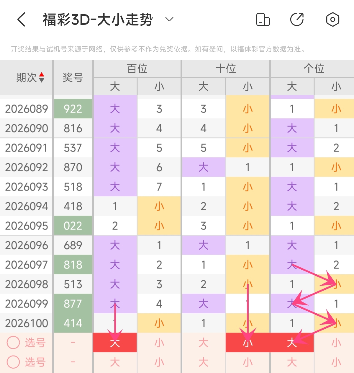 首先让我们回顾一下上期福彩3D第20260100期开奖号码为414,为组三形态,大小比为0:3,奇偶比为1:2,跨度为3,和值为9。