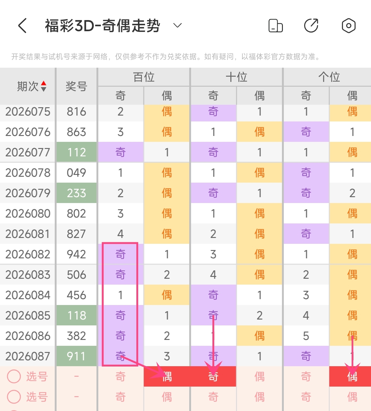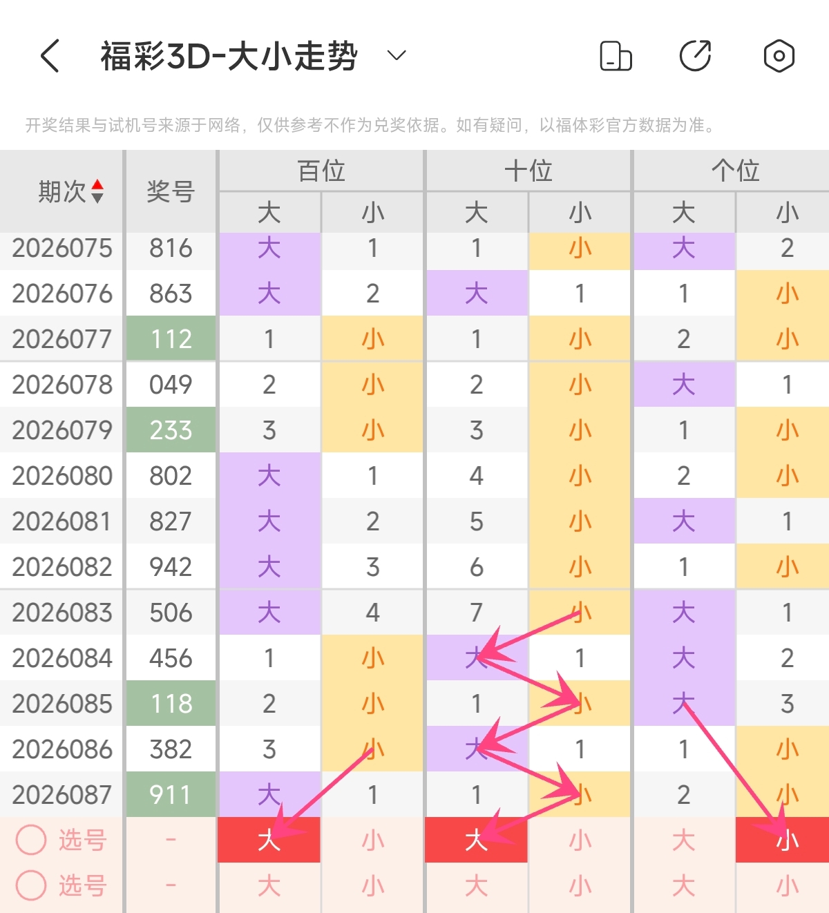 首先让我们回顾一下上期福彩3D第2026087期开奖号码为911,为组三形态,大小比为1:2,奇偶比为3:0,跨度为8,和值为11。