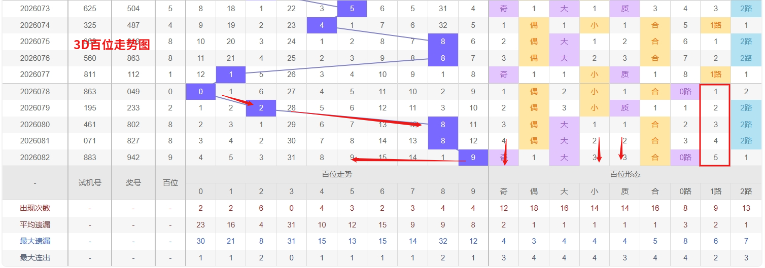 福彩3D百位分析:第2026082期百位开出号码9属于大奇数,从上面百位走势图上可以看出近100期大小比约为48:52奇偶比约为55:45。近期数据还是比较极端的符合文章开头介绍的求均衡规律非等量现象。但这种均衡不会持续最终会被偏态运行打破,然后循环往复。但短期内大小相差1点,小数过热大数有回补需求本期个人认为走大数的概率更高。上期百位落号“9”号球,在百位号码开出0路号码9后向大数方向走出1个振幅。那么通过分析上期百位落位号码分析,号码走出1个振幅,号码走为大奇数,开出0路号码9。通过对百位落号趋势来分析,百位号码落位后端,通过对近10期的走势来看百位号码大小交替频繁走3期大数又走2小数,3D百位走势上,近期需要重点关注两个方向:其一是冷号回补,当前有一个号码已经遗漏31期未出,成为百位最冷的数字,从历史出号规律来看,长期深冷之后往往会迎来回补动作,接下来可适当关注该冷号在百位上的反弹;其二是热号延续,目前有一个4热号表现活跃,短期内多次出现,热度尚未消散,这种强势号码往往有连出或密集开出的习惯,加以防范。我们在百位关注的重点在01346这5个号码球上,百位号码近期奇偶切换频繁,9号球码属于0路号码奇数,现奇数开出过多有向偶数的趋势。所以福彩3D第2026083期百位看01346。
