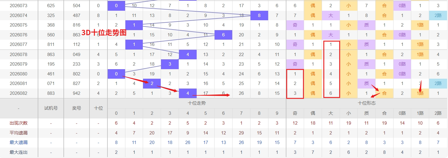 福彩3D十位分析:第2026082期十位开出号码4属小偶数号码前端。以历史100期数据为例十位奇偶比约为45比55,大小比约为49比51近期大小相差2点,根据求均衡的规律开出小数的概率比大数高一点。上期我们分析奇数经过连续回补后有走偶数的可能,开出奖号4小偶数符合我们的预期,3D十位走势上,近期0热号表现活跃,出现频率明显高于其他数字,且该热号具备较强的连下惯性,接下来仍有可能继续出现,需重点关注;与此同时,7冷号已经遗漏较长时间,成为十位上的一个明显冷态,从历史出号规律来看,长期深冷之后往往会迎来回补动作,不得不防。综合而言,十位选号时既要留意0热号的连下势头,也要兼顾7冷号的反弹可能,所以福彩3D第2026083期十位推荐02579。