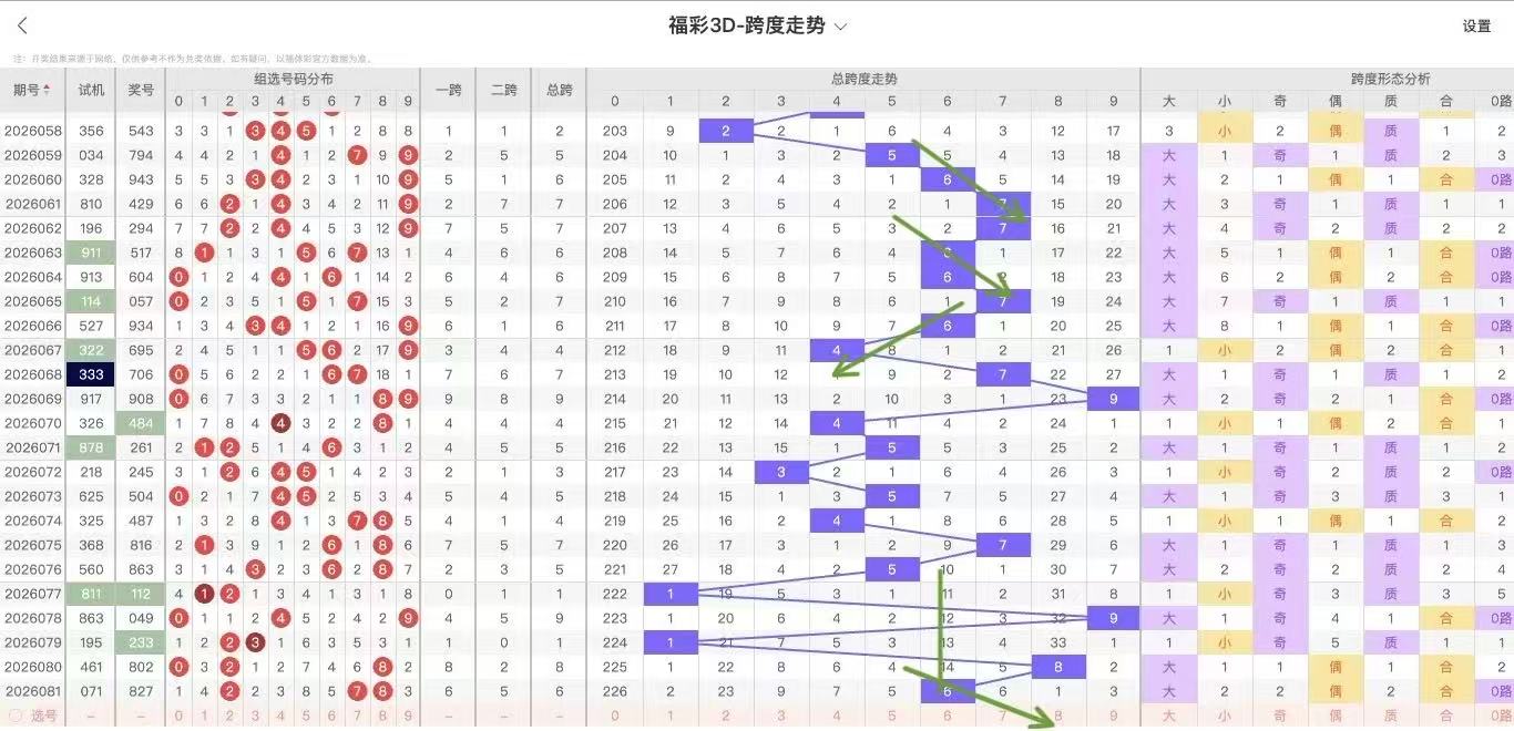 10期内跨度走势为:4-3-6 -4-8-8-3-8-7-9,10期内大小跨比为7:3,奇偶跨比4:6,百期内跨度9共开出10次,下期数据:3 2 6 3 4 6 7 9 7 近期较热,考虑跨度9开出后容易出大跨度,近期大小规律大:奇:质,所以接下来继续大跨,奇跨度表现!