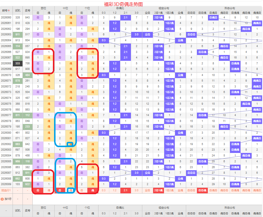 上期奇偶比是1:2,两偶的号码组合方式,从近五期的奇偶数出现情况看,奇数出现7次,偶数出现8次,奇数偶数号码出现较平均,本期侧重两奇的号码组合,侧重奇奇偶或奇偶偶的号码组合方式,根据奇偶形态做五码定位13579/13579/02468或13579/02468/02468