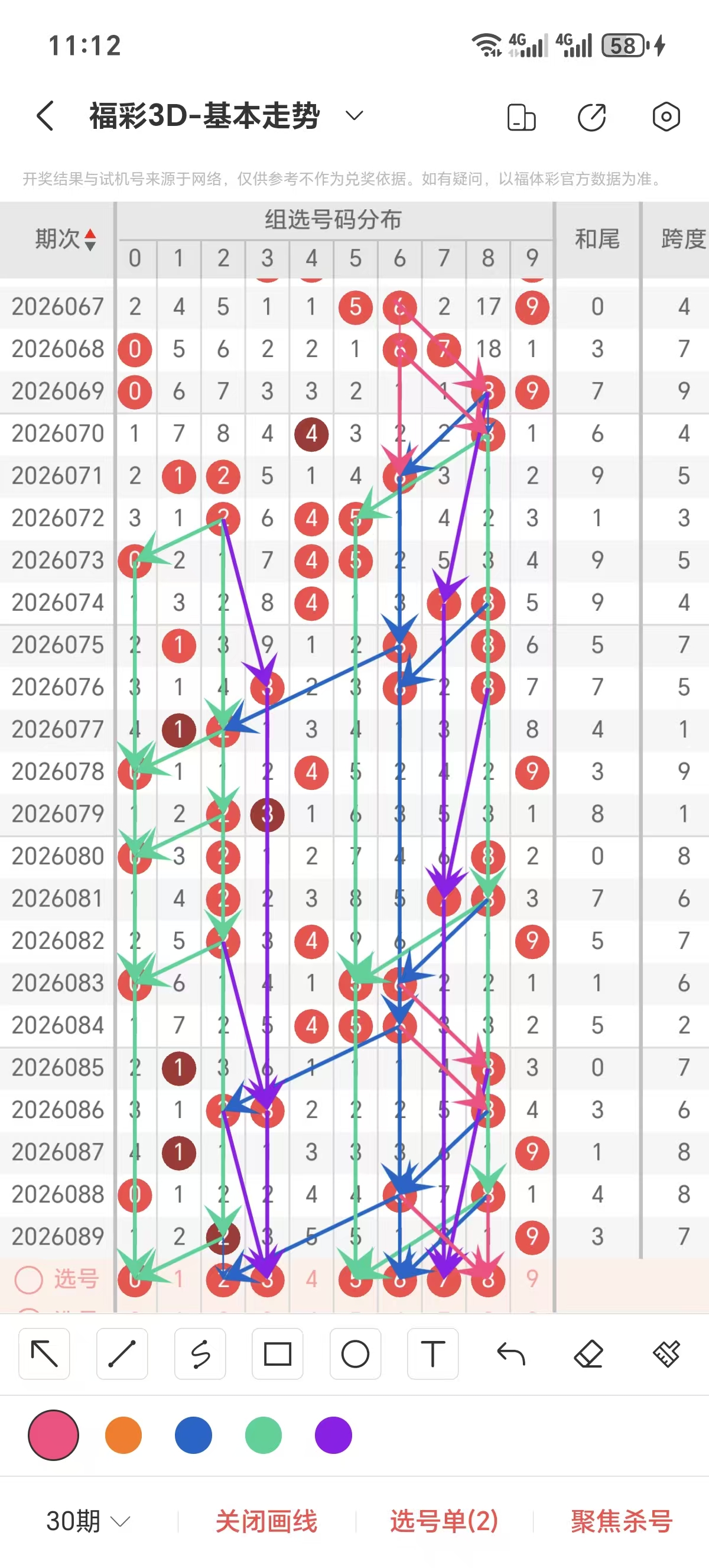 跨度通常情况下在五期之内重复一个跨度的概率很高,近五期重复了7/8的跨度,近五期跨度为7/6/8/8/7,近期12路的跨度较热,上期是1路的跨度,本期要侧重跨度以3/5/6跨为主的号码组合。可以从跨度方面选择相应的双胆码组合,双胆码的选取要根据近期和历史的走势进一步的分析选取。