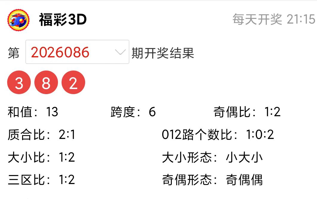 上期开出两偶一奇3、8、2,和值:13,跨度:6,奇偶比:1:2,质合比:2:1,大小比:1:2, 012路个数比:1:0:2
