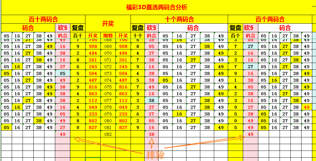 秉持化繁为简、去芜存菁之念,先将“百十、十个、百个”三组两码合值的数字,依旧按05、16、27、38、49的规律,归为五组,化零为整。依据复盘所得的两码合数字,搭建研判表格,直观呈现,便于参考: