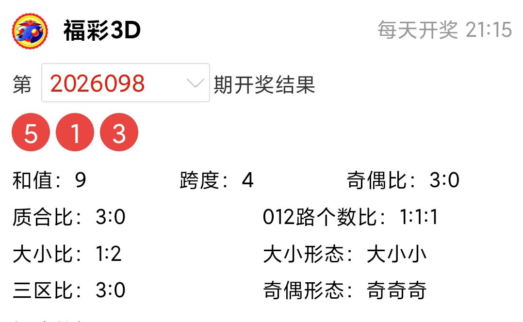 福彩3D第2026099期分析,本期看好偶号,金胆5号!