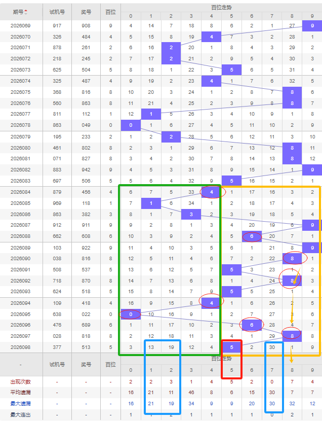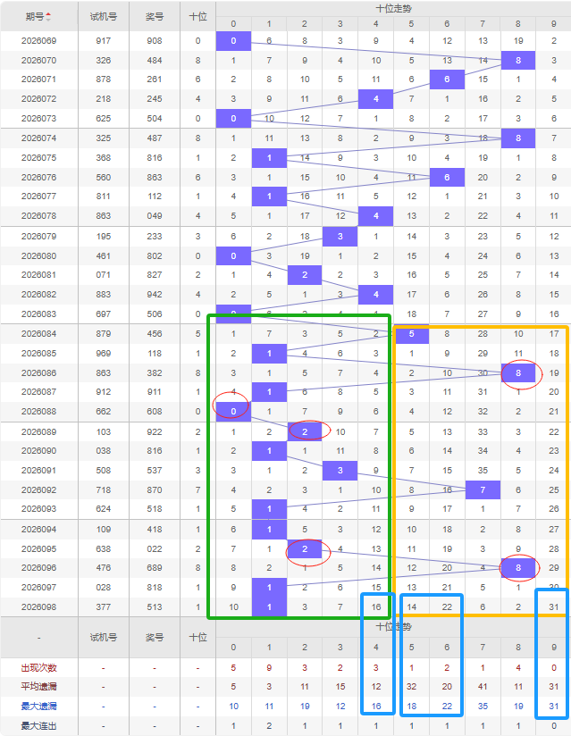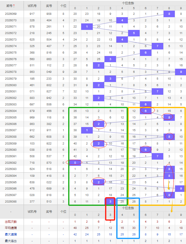 福彩3D第2026099期个位先分析奇数偶数,近十五期开出奇数号4期,开出偶数号11期,开出偶数号的概率比开出奇数号的概率大不少。近十余期都是奇数偶数间隔开出的,上一期又开出了奇数3号,近五期已经连出3期偶数了本期还是看好开出奇数,建议考虑遗漏期数较大的奇数号,比如5号遗漏十期以上且达到平均遗漏期数和最大遗漏期数,都可以防冷号开出。其次近十五期只有一次重号开出,那么本期继续看好3号开出。