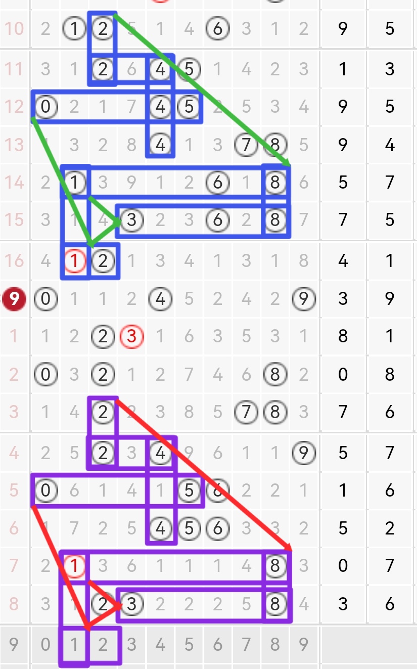 综合以上三张图分析判断087期形态01234小区占优势出2-3码,大区56789出0-1码,形态判断组三