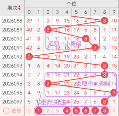 近7期(091~097)开奖号个位号码球分别为7、0、8、8、2、9、8,开奖号与上一期走出的振幅分别为1、7、8、0、6、7、1。091期走出7号大数号码球,走出“1”的小幅度,092期走出0号小数号码球,走出“7”的大幅度,093期走出8号大数号码球,走出“8”的大幅度,094期走出8号大数号码球,走出“0”的小幅度,095期走出2号小数号码球,走出“6”的中大幅度,096期走出9号大数号码球,走出“7”的大幅度,097期走出8号大数号码球,走出“1”的小幅度;从近期振幅大小的走势及大小走势来看,中大振幅走在4~7之间较为适宜,中小振幅走在0~3之间较为适宜;结合走势图的整体及大小走势分析,本期个位应重点关注号码球为1、4、5、6、7、8。