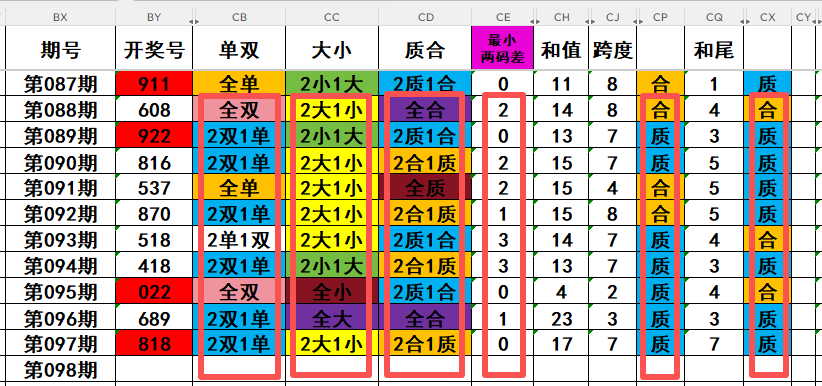 4,最近10天当中,最小两码差0开出3次,最小两码差1开出2次,最小两码差2开出3次,最小两码差3开出2次,