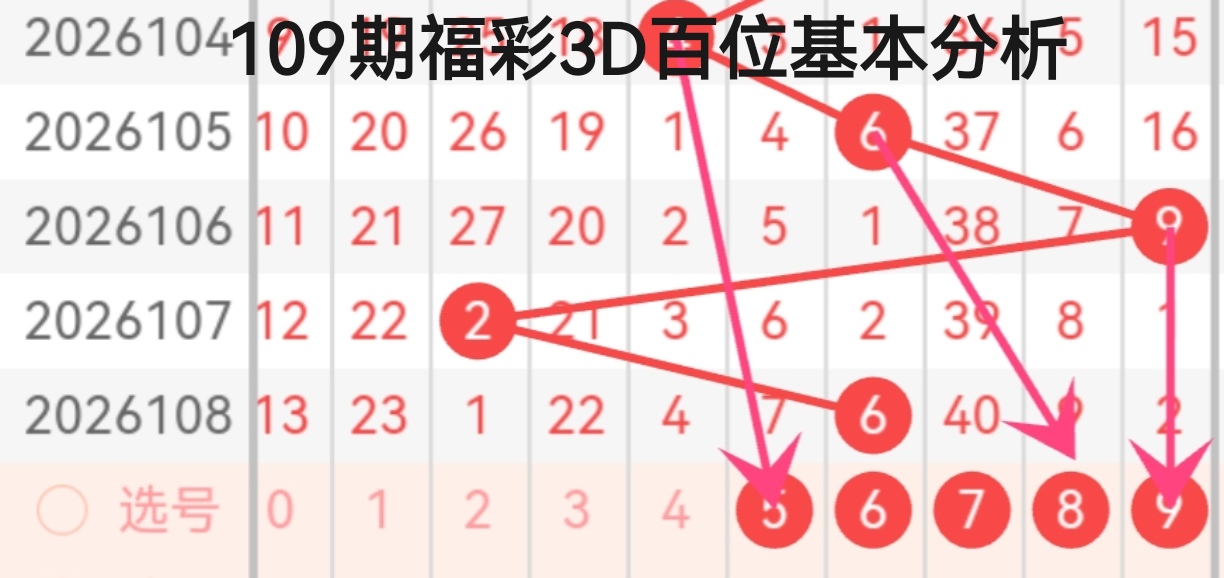 从趋势箭头的指向来看,2026107期的2号与2026108期的6号,分别通过不同的箭头指向了5、8、9三个号码。其中,5号承接了前期奇数的间隔回补节奏,8号延续了偶数连出的惯性,9号则作为高位奇数,承接了1号开出后的奇数回补需求。综合冷热号与箭头指向来看,百位优先关注5、8、9,其中5号作为冷号回补的首选,具备较高的出号潜力,8号可作为偶数延续的备选,9号则作为防冷号的补充选择。