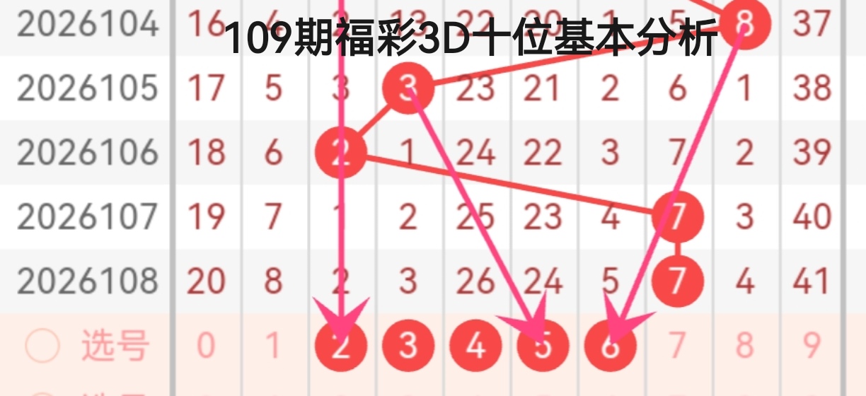从箭头指向来看,2026105期的3号、2026106期的2号、2026107期与2026108期的7号,分别指向了2、5、6三个号码。2号延续了前期低位号的回补惯性,5号承接了奇数的间隔回补节奏,6号则作为中间偶数,承接了低位号向高位号过渡的衔接需求。其中,2号作为前期开出过的号码,具备回补的概率,5号作为冷号,在奇数交替的节奏下具备较强的出号潜力,6号则作为中间号,可作为防遗漏的备选。综合来看,十位重点关注2、5、6,其中5号可作为核心号码,2号与6号作为辅助选择,覆盖高低位与奇偶的均衡分布。