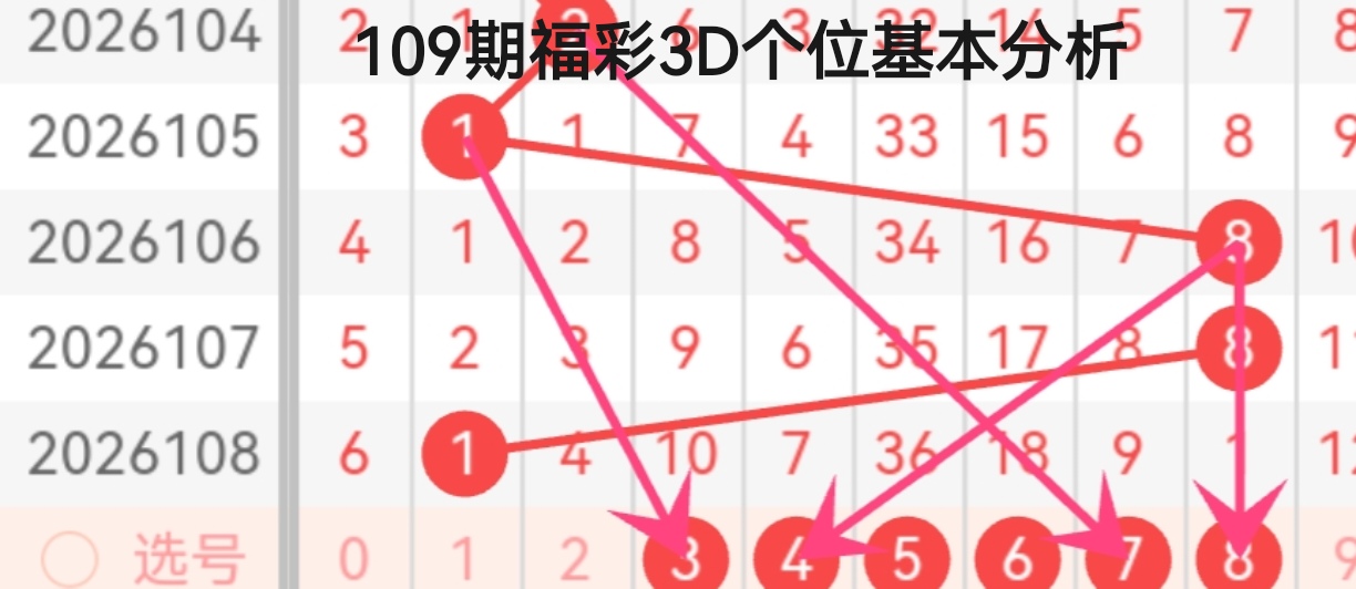 从箭头指向来看,2026105期的1号、2026106期与2026107期的8号、2026108期的1号,分别指向了3、4、7、8四个号码。其中,3号与4号作为中间低位号,承接了前期低位号的回补需求,7号作为中间高位号,承接了8号开出后的奇数回补节奏,8号则延续了连号的惯性。综合冷热号与形态来看,个位优先关注3、4、7、8,其中7号作为中间高位号,具备填补中间号空白的潜力,8号可作为连号延续的备选,3号与4号作为低位号回补的补充选择。