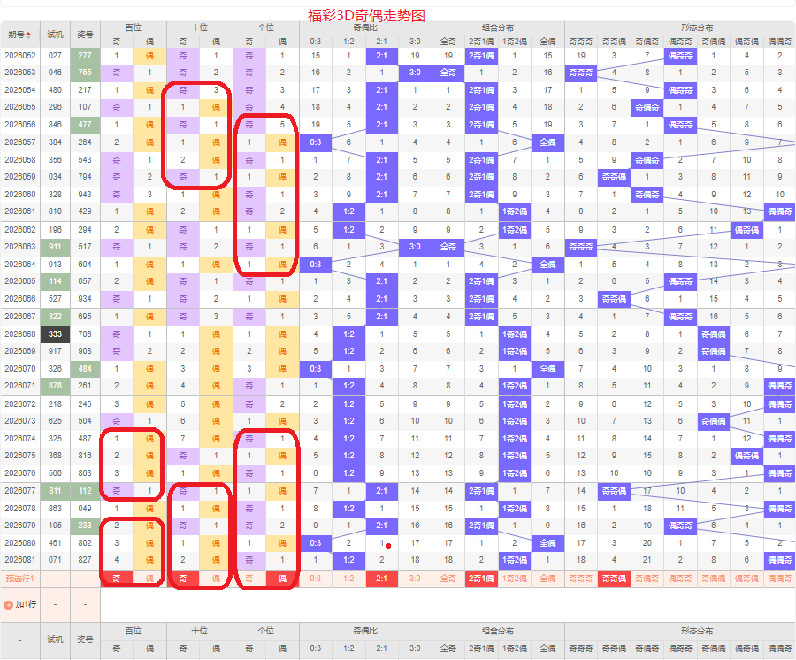 百位近四期是偶数的号码,侧重大号码,侧重奇数的号码,侧重1路和2路的号码,侧重号码12579。