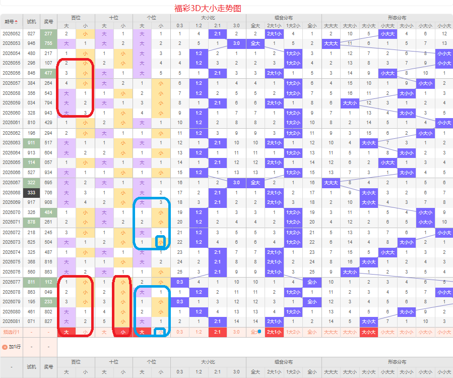 上期大小比为2:1,两大的号码组合方式,从近五期出现情况看,大号码出现4次,小号码出现11次,大号码出现较少,本期侧重两大的号码组合,本期百位侧重大号码,十位侧重小号码,个位要侧重看大,侧重大小大或者大小小的号码组合,根据大小做五码定位56789/01234/56789或56789/01234/01234