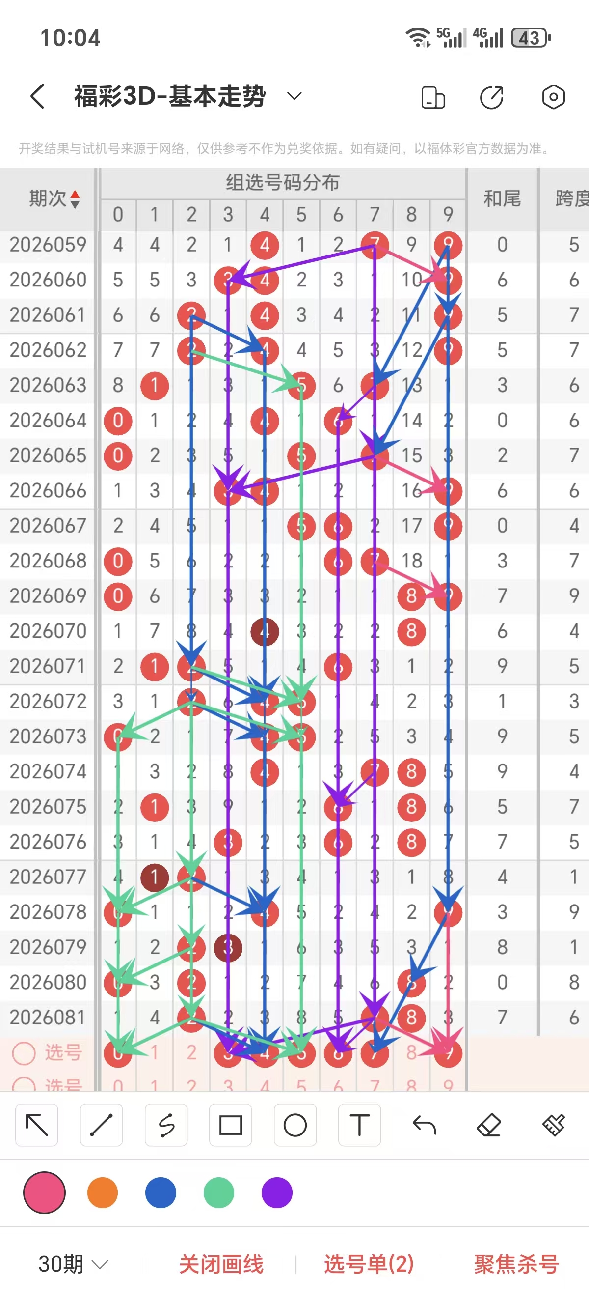 跨度通常情况下在五期之内重复一个跨度的概率很高,近五期重复了1的跨度,近五期跨度为1/9/1/8/6,近期01路的跨度较热,上期是0路的跨度,本期要侧重跨度以3/7/9跨为主的号码组合。可以从跨度方面选择相应的双胆码组合,双胆码的选取要根据近期和历史的走势进一步的分析选取。