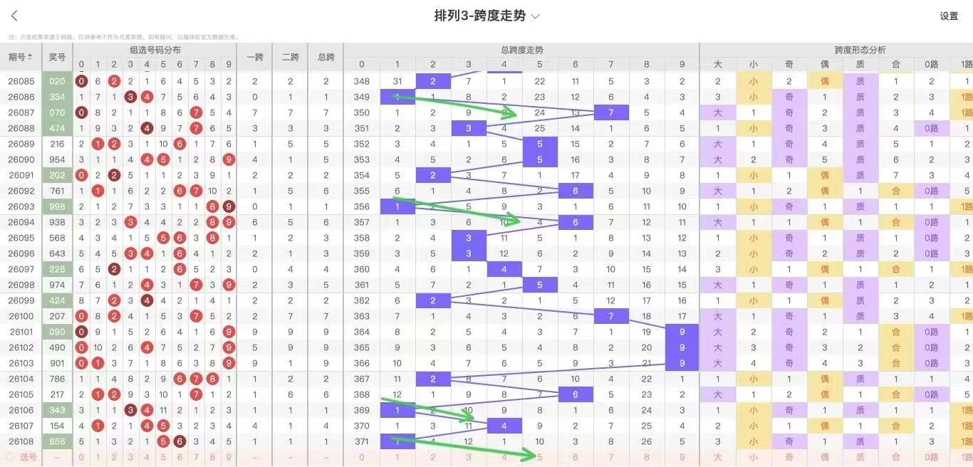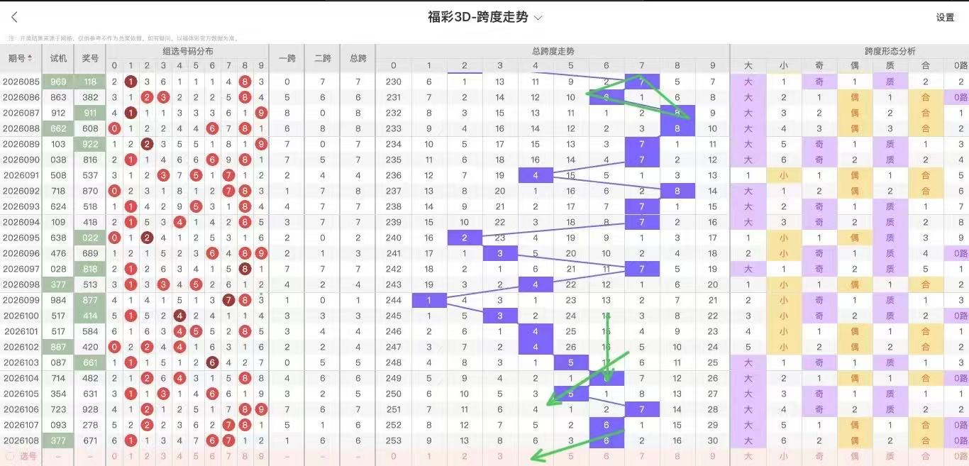 10期内跨度走势为:7-2-9-9-9-2-6-1-4-1,10期内大小跨比为5:5,奇偶跨比6:4,百期内跨度1共开出7次,下期数据:1 3 5 4 7 6 4近期较热,考虑跨度1开出后容易出大跨度,近期大小规律大:偶:合,所以接下来继续大跨,奇跨度表现!