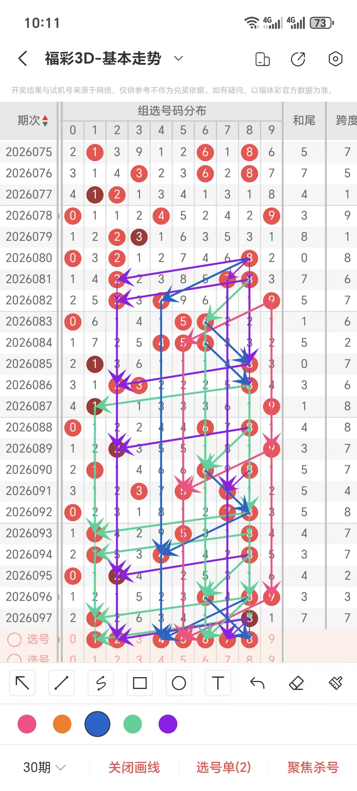 跨度通常情况下在五期之内重复一个跨度的概率很高,近五期重复了7的跨度,近五期跨度为7/7/2/3/7,近期1路的跨度较热,上期是1路的跨度,本期要侧重跨度以4/7/8跨为主的号码组合。可以从跨度方面选择相应的双胆码组合,双胆码的选取要根据近期和历史的走势进一步的分析选取。
