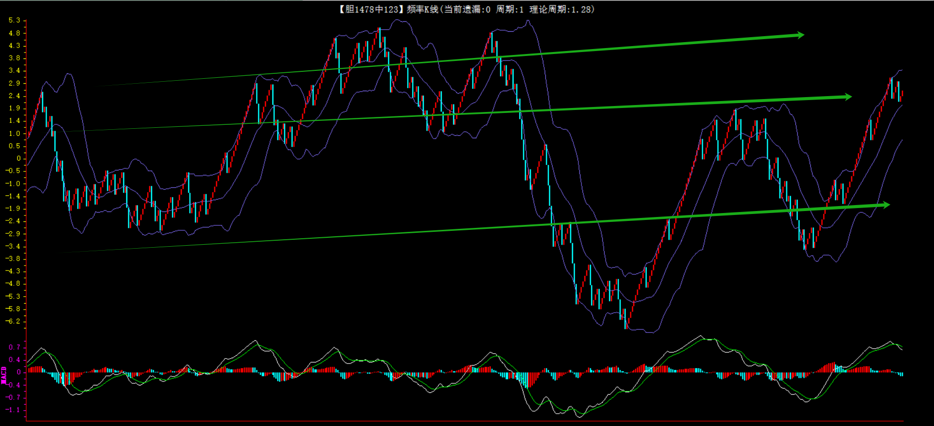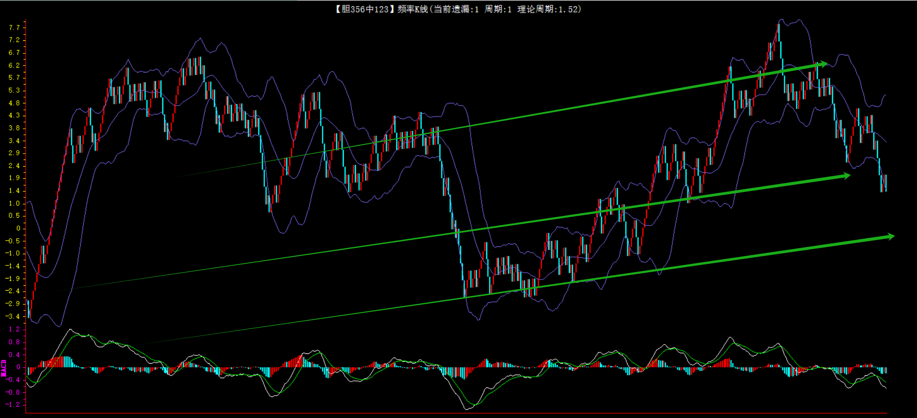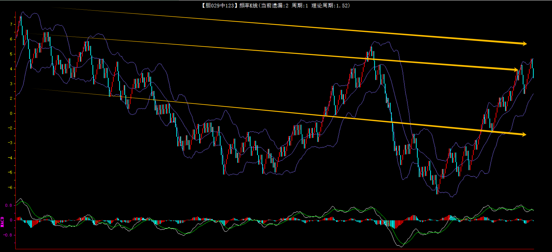 整体趋势下行,上边沿线趋势向下,下边沿趋势也是向下,节点震荡,当前遗漏2期,本期防守。