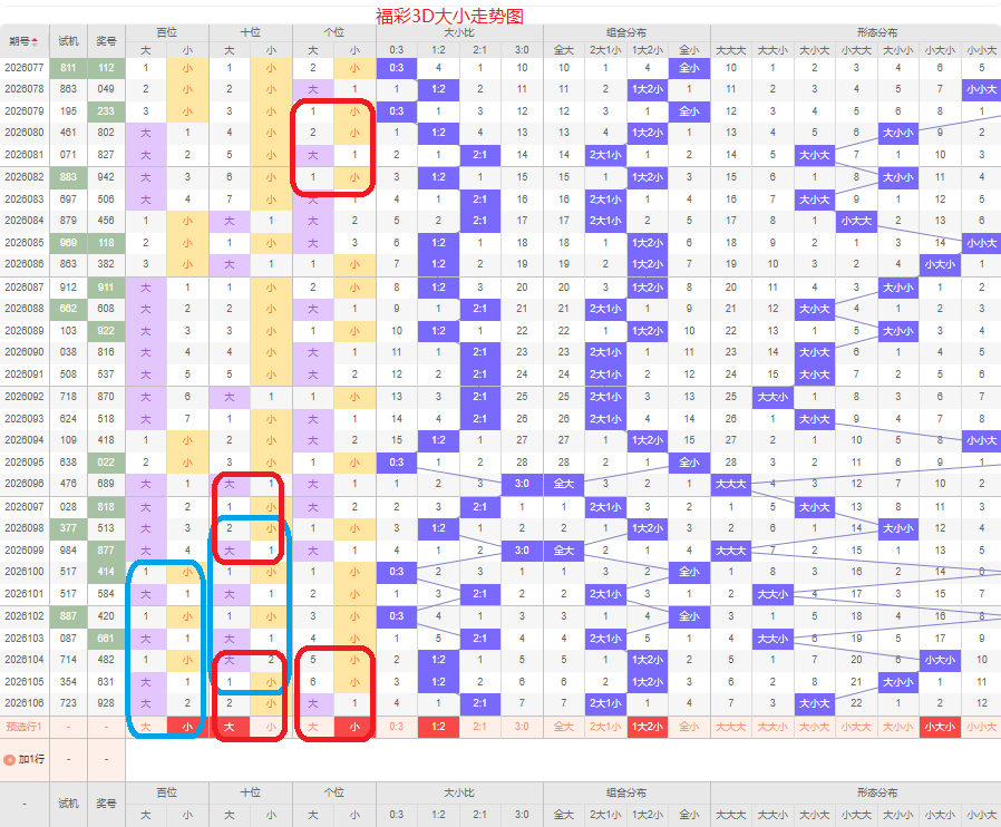 上期大小比为2:1,两大的号码组合方式,从近五期出现情况看,大号码出现6次,小号码出现9次,大号码出现较少,本期侧重两小的号码组合,本期百位侧重小号码,十位侧重大号码,个位要侧重看小,侧重小大小或者小大大的号码组合,根据大小做五码定位01234/56789/01234或01234/56789/56789